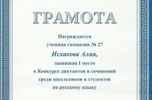 Поздравляем Исхакову Алию, ученицу 11 А класса, занявшую I место в Конкурсе диктантов и сочинений среди школьников и студентов по русскому языку, который проводился в Казанском (Приволжском) федеральном университете. Желаем новых успехов и достижений!