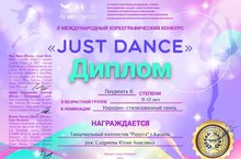 Стали известны результаты ll Международного хореографического конкурса "Just dance" г. Санкт- Петербург. Старшие девочки танцевального коллектива "Радуга" (Галиуллина Ангелина, Калмурзаева Айдана, Кузнецова Анна, Сарварова Алиса, рук. Садриева Ю.А.) получили диплом Лауреата ll степени в номинации "Народно-стилизованный танец". Поздравляем!