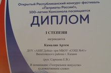 02.11.2018г состоялся открытый Республиканский конкурс-фестиваль "Патриоты России!", посвященный 100-летию Комсомола. Наш детский сад в этом конкурсе представил Камалян Артём. Великолепно читал стихи С.Михалкова "Нет войны", проявил актерское мастерство, покорил жюри своим проникновенным исполнением и за это награжден дипломом I степени в номинации "Театральное искусство-художественное слово". Ждём дальнейших достижений!