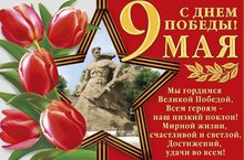 Мы поздравляем всех жителей нашей страны С Днем Победы! Этот праздник с каждым годом отдаляется от нас. Но мы никогда не должны забывать о тех героических поступках, которые совершили наши предки во имя свободы, чести и благополучной жизни. В этот праздник хочется в первую очередь пожелать мира. Пусть эта победа вдохновляет только на хорошие поступки, любовь к Родине. Пусть никто и никогда не увидит войны. С Праздником!