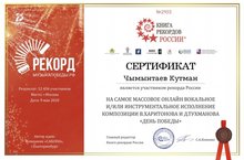 Поздравляем учащегося 7 класса Чемынтаева Кутманбека (классный руководитель Тухбатуллина Л.Ф). Он получил сертификат об участии в конкурсе «Книга рекордов Росии». Мы гордимся достижениями наших ребят. С певческим талантом Котманбека школа хорошо знакома. Он принимал активное участие в праздничных концертах. Молодец!