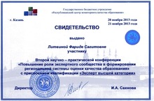 20-21 ноября 2013 года в г.Казани состоялась конференция "Повышение роли экспертного сообщества в формировании региональной системы оценки качества образования". На этой конференции выступила с докладом учитель русского языка и литературы Литвина Ф.С. С 2005 года Фарида Сагитовна входит в состав Республиканской предметной кимиссии по проверке ЕГЭ. Ей была присвоена квалификация "Эксперт высшей категории"
