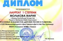 Поздравляем ученицу 6г класса Молькову Марию! Наша воспитанница получила диплом Лауреата 1 степени в Международном фестивале "Детство без границ" в конкурсе юных вокалистов "Детские песни о главном"!!! Молодец!!!