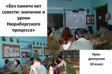 70-летию Нюрнбергского процесса посвящена серия мероприятий, состоявшихся нашей школе 15 января 2016 года в раках единого Дня памяти, которые стали продолжением просмотра фильма заместителя Генерального прокурора РФ А.Г. Звягинцева «Нюрнберг: 70 лет спустя», проведенные учителем истории Бастраковой И.В. -