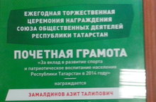 Почётной грамотой Министерства образования и науки РТ "За вклад в развитие спорта и патриотическое воспитание населения Республики Татарстан в 2014 году" награжден директор нашей школы Замалдинов Азит Талипович!