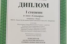 Наши ученики 11В класса Федосеенков Тимур, Конопля Олеся, Нигметзянов Рауль, Имамова Гульнара, Хафизова Амалия участвовали в "XII Республиканском Турнире юных биологов" и заняли 1 место. Огромные слова благодарности учителю биологии Елене Юрьевне Акшаевой.