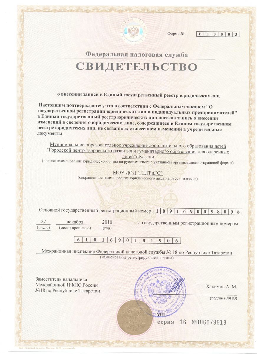 СВИДЕТЕЛЬСТВО о внесении в Единый государственный реестр юридических лиц