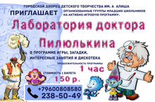 МБУДО "Городской дворец детского творчества им. А Алиша" ПРИГЛАШАЕТ организованные группы младших школьников на Активно-игровую программу "Лаборатория доктора Пилюлькина". В программе игры, загадки, интересные занятия и дискотека. Продолжительность программы - 1 час. Стоимость 1 билета - 150 руб.