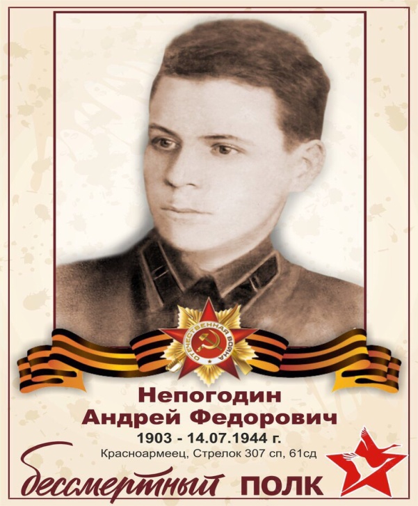 Мой прадед погиб в июле 1944, в тот год в голодной Казани получили похоронку и остались сиротами трое мальчишек – мой дед и еще двое - «мал мала меньше». Жесткие, жестокие и горькие слова известия с фронта знают наизусть теперь все в нашей большой семье: «Непогодин Андрей Федорович красноармеец, стрелок погиб в бою за Социалистическую Родину, верный воинской присяге, проявив геройство и мужество, был убит 14 июля 1944 года». Он писал жене с фронта: «Галчонок, милая, умереть не страшно, страшно жить с мыслью, что наши мальчишки могут попасть в плен к фашистам».