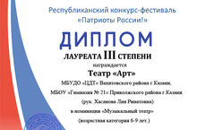 Подведены итоги Республиканского конкурса-фестиваля "Патриоты России!", в котором приняли участие учащиеся театра "Арт" (педагог Лия Ринатовна Хасанова).