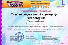 Поздравляем коллектив студии современной хореографии "Мистерия" и его руководителя Елену Евгеньевну Егорову. Танцевальная композиция "Летели облака" в исполнении коллектива была признана лучшим номером фестиваля "Серпантин искусств", прошедшем 28 сентября 2022 года в Севастополе.