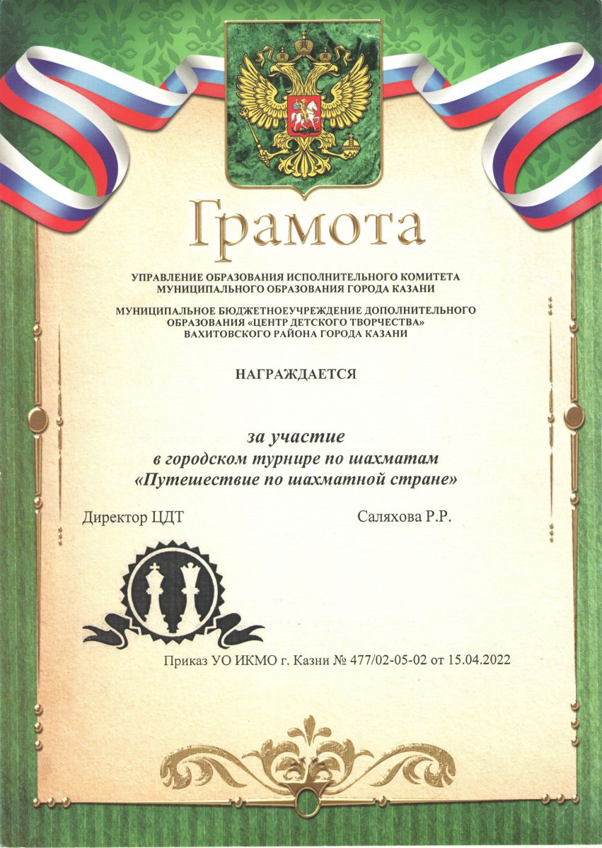 Уважаемые участники городского шахматного турнира "Путешествие по шахматной стране"! Если вы не вошли в категорию победителей и призеров, но вам хочется иметь подтверждение своего участия в нем, вы можете скачать грамоту за участие в турнире, распечатать ее и принести в Центр детского творчества по адресу: ул. Лево-Булачная, 48/1 для подписи.