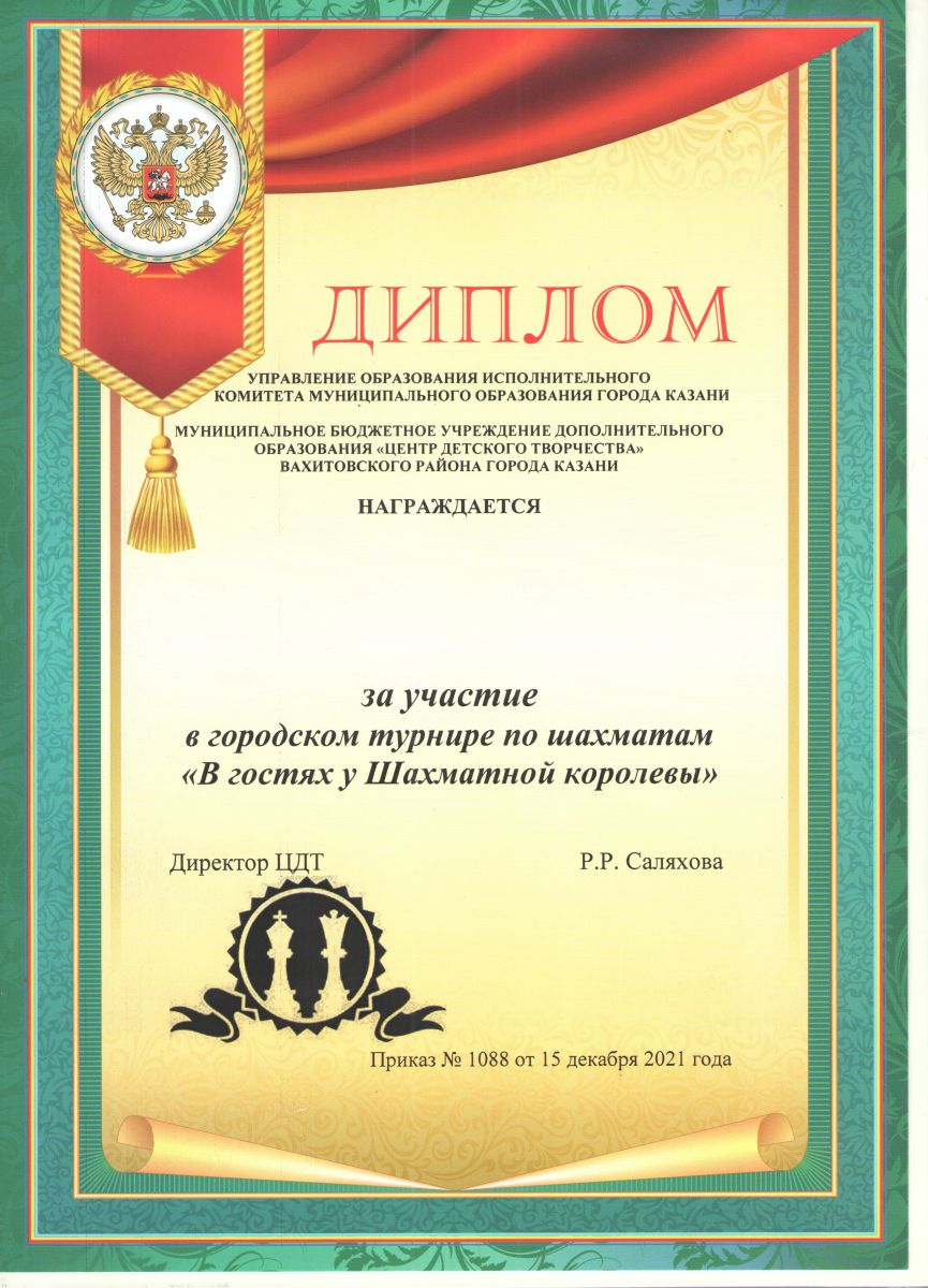 Грамоту за участие в городском шахматном турнире