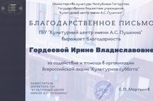 Педагог Центра детского творчества Ирина Владиславовна Гордеева приняла участие в организации и проведении Всероссийской акции "Культурная суббота", которая прошла в сентябре этого года в Культурном центре им. А.С. Пушкина.