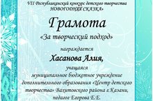 Поздравляем Хасанову Алию, учащуюся студии "Завиток" (руководитель Елена Евгеньевна Егоровой) с получением грамоты "За творческий подход" VII Республиканского конкурса детского творчества "Новогодняя сказка".