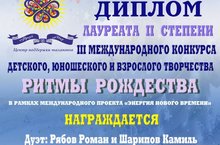Поздравляем учащихся театра эстрады. сатиры и юмора "ЕрашОК" Рябова Романа и Шарипова Камиля и их педагога Ирину Владиславовну Гордееву с получением диплома лауреата II степени III международного конкурса детского, юношеского и взрослого творчества "Ритмы Рождества" в рамках международного проекта "Энергия нового времени", проходившего в г. Самара с 6 по 12 февраля 2021 года.