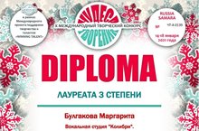 Поздравляем учащуюся вокальной студии "Колибри" Булгакову Маргариту и ее руководителя Лилию Маратовну Юнусову с получением диплома лауреата III степени X международного творческого конкурса "Чудеса творения"!