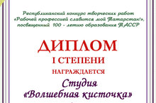 Поздравляем студию "Волшебная кисточка" под руководством Фоменко Алины Рустемовны с дипломом 1 степени в республиканском конкурсе творческих работ "Рабочей профессией славится мой Татарстан!", посвященном 100-летию образования ТАССР!