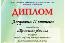 Поздравляем Ибрагимову Аделину, учащуюся студии "Волшебная кисточка" (руководитель Алина Рустемовна Фоменко) с дипломом лауреата II степени IV Республиканского конкурса детского творчества "Таланты Татарстана" в номинации "Моя малая Родина"! Молодец! Желаем дальнейших творческих побед!