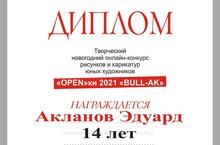 Поздравляем Акланова Эдуарда, учащегося студии "Волшебная кисточка" (руководитель Алины Рустемовны Фоменко) с дипломом участника творческого новогоднего онлайн-конкурса рисунков и карикатур юных художников "OPENки" 2021 "BULL-AK". Работа Эдуарда была отобрана и опубликована в журнале сатиры и юмора "Чаян"!