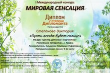 Поздравляем Степанову Викторию, учащуюся вокальной студии "Шатлык" (руководитель Миляуша Рифатовна Альмеева) с получением диплома 2 степени I международного конкурса "Мировая сенсация"!