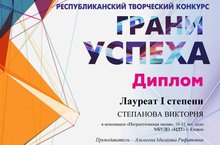 Поздравляем Степанову Викторию, учащуюся вокальной студии "Шатлык" (руководитель Миляуша Рифатовна Альмеева) с получением диплома лауреата I степени в номинации "Патриотическая песня" республиканского творческого конкурса "Грани успеха"!