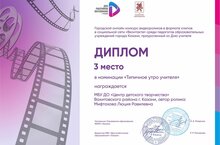 В октябре педагогический коллектив Центра детского творчества участвовал в городском онлайн конкурсе видеороликов в формате клипов в социальной сети "ВКонтакте" среди педагогов образовательных учреждений г. Казани, приуроченном ко Дню учителя. Шуточный клип "Типичное утро учителя", созданный нашими педагогами, очень понравился членам жюри и занял почетное III место. Поздравляем!