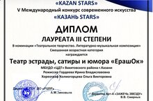 Поздравляем коллектив театра эстрады сатиры и юмора "ЕрашОК" и его руководителей: Ирину Владиславовну Гордееву и Ольгу Викторовну Холмогорцеву с очередным творческим достижением - получением звания лауреатов III степени международного конкурса современного искусства "Kazan stars" в номинации "Театральное творчество. Литературно-музыкальная композиция"! Молодцы!