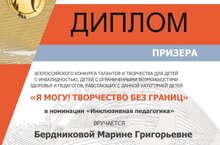 Поздравляем педагога Бердникову Марину Григорьевну, ставшую призером Всероссийского конкурса талантов и творчества детей с инвалидностью, детей с ограниченными возможностями здоровья и педагогов, работающих с данной категорией детей "Я МОГУ! ТВОРЧЕСТВО БЕЗ ГРАНИЦ" в номинации "Инклюзивная педагогика"!