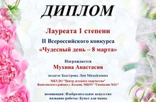Поздравляем учащихся студии "Радуга творчества": Мухину Анастасию и Бирюкову Марию (педагог Быстрова Л.М.) и учащуюся студии "Мастерица" Чермакову Дину (педагог Ионова Е.В.) с победой во II Всероссийском конкурсе "Чудесный день - 8 марта"! Молодцы! Желаем дальнейших творческих побед!
