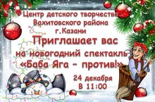 24 декабря в 11.00 в Центре детского творчества состоится новогоднее представление для младших учащихся и детей с ограниченными возможностями "Баба Яга - против!" Во время мероприятия вы сможете посетить выставку лучших работ городского конкурса изобразительного и декоративно-прикладного творчества "Новый год в сказку добрую зовет", посмотреть спектакль в исполнении коллектива театра-студии "Ровесник" (педагог М.Ю.Андреева), получить поздравление от Деда Мороза и Снегурочки и сфотографироваться в новогодней фотозоне. Приходите, будет интересно!