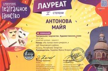 Целую россыпь наград собрала на прошедших этой осенью творческих конкурсах и фестивалях Антонова Майя, учащаяся театра эстрады, сатиры и юмора "ЕрашОК" под руководством педагога Ирины Владиславовны Гордеевой. Майя стала лауреатом I степени международного конкурса-фестиваля "Мое призвание - Артист", лауреатом I степени международного конкурса-фестиваля "Открытые мечты", лауреатом I степени IV международного фестиваля-конкурса "Театральное единство", лауреатом I степени V открытого всероссийского многожанрового фестиваля-конкурса дарований и талантов "Величие России". От всей души поздравляем Майю и Ирину Владиславовну с такими потрясающими результатами и желаем новых творческих достижений!