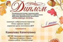 Поздравляем Камалову Капитолину, учащуюся студии "Озорные краски" (руководитель Карина Маратовна Гиздатуллина), с завоеванием I места в республиканском конкурсе творческих работ "Красавица осень"! Желаем дальнейших творческих побед!