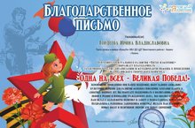 Диплом победителя I степени во всероссийском творческом конкурсе "Одна на всех — Великая Победа" завоевала Геркина Виктория учащаяся театра эстрады, сатиры и юмора "ЕрашОК" под руководством Ирины Владиславовны Гордеевой. Кроме этого организаторы конкурса выразили благодарность педагогу за большую организационную и методическую помощь в проведении всероссийского творческого конкурса.