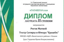 В XV Поволжском конкурсе эстрадного мастерства детских и юношеских творческих коллективов "Tatarstan.ru" лауреатом II степени в номинации "Театральное искусство — художественное слово" стал учащийся объединения театра, эстрады, сатиры и юмора "ЕрашОК" Рогов Матвей. Лауреатами II степени в номинации "Литературные композиции" стали: Родионова Марианна и Яхонт Матвей. Поздравляем ребят и их педагога Ирину Владиславовну Гордееву!