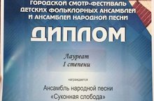 14 апреля ансамбль народной песни "Суконная слобода" (рук. М.В. Стуклова, конц. Ю.И. Глебов) стал Лауреатом 1 степени Городского смотра-фестиваля детских фольклорных ансамблей и ансамблей народной песни! Поздравляем ребят и руководителей с отличным результатом!