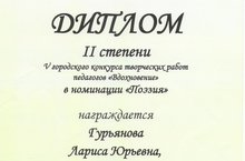 Поздравляем директора ДШИ им. М.А. Балакирева Ларису Юрьевну Гурьянову, принявшую участие в V городском конкурсе творческих работ педагогов "Вдохновение" в номинации "Поэзия" и ставшую обладателем Диплома II степени! Желаем нашему руководителю дальнейших творческих побед!