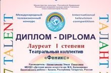 Театральный коллектив "Феникс", класс преподавателя Нигматзяновой Эльзы Ринатовны, стал обладателем диплома Лауреата I степени на Международном телевизионном конкурсе "Talent - 2017". Поздравляем победителей!!!
