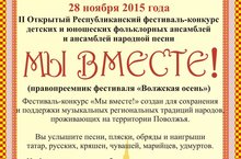 28 ноября 2015 года в концертном зале детского «Экият» состоится II Открытый Республиканский фестиваль-конкурс детских и юношеских фольклорных ансамблей и ансамблей народной песни «Мы вместе» (правопреемник фестиваля «Волжская осень»).