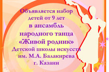Объявляется набор детей от 9 лет в ансамбль народного танца «Живой родник» Детской школы искусств им. М.А. Балакирева г. Казани.