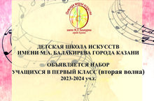 ДЕТСКАЯ ШКОЛА ИСКУССТВ ИМ. М.А. БАЛАКИРЕВА ГОРОДА КАЗАНИ ОБЪЯВЛЯЕТ НАБОР В 1 КЛАСС НА БЮДЖЕТНОЙ ОСНОВЕ (вторая волна) на 2023-2024 уч.г. Полную информацию можно посмотреть здесь.