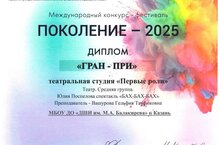 Учащиеся театрального отделения студия "Первые роли" преподавателя Вашуровой Гельфии Тауфиковны стали обладателями ГРАН-ПРИ на международном конкурсе-фестивале "Поколение-2025"!