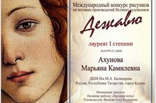 Воспитанница студии "Семь чудес света" ДШИ им. М.А.Балакирева преподавателя Валеевой Алсу Камилевны Ахунова Марьяна стала лауреатам I степени на Международном конкурсе рисунков по мотивам Великих Художников "Дежавю"!
