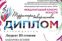Поздравляем Башарову Ксению и ее преподавателя Сайфутдинову Светлану Сергеевну с отличным выступлением и званием лауреата III степени в Международном конкурсе искусств «Территория творчества»! Желаем творческих успехов!