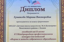 Поздравляем преподавателя по классу фортепиано Ермакову Марину Викторовну с победой в I Международном профессиональном конкурсе для педагогов "Формы и методы современного образования" с конкурсной работой: "Конспект урока. Работа над произведением крупной формы в младших классах фортепиано".