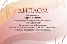 Поздравляем преподавателя Лозовскую Ольгу Васильевну с победой в Международном педагогическом конкурсе «Арт-сценарий». Ольга Васильевна представила свою конкурсную работу «Литературно-музыкальный вечер «Песня моя научила свободе…», посвящен 115-летию со дня рождения Мусы Джалиля» и была удостоена звания лауреата II степени. Поздравляем и желаем творческих успехов!
