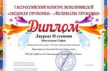 Учащаяся музыкального отделения по классу фортепиано преподавателя Халиковой Н.Г. Мингалиева София приняла участие во Всероссийском конкурсе исполнителей «Звездная гармония- Йолдызлы гармония» и стала лауреатом II степени! Поздравляем и желаем дальнейших успехов!