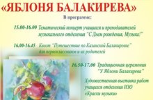 1 октября 2019 г. Казанская Балакиревка проведет традиционный школьный праздник для первоклассников и родителей "Яблоня Балакирева". В 15.00 программу начнет тематический концерт учащихся и преподавателей музыкального отделения "С Днем рождения, Музыка!", далее участники смогут пройти квест "Путешествие по Казанской Балакиревке" и завершит праздник традиционная церемония "У Яблони Балакирева". Также пройдет художественная выставка работ учащихся отделения ИЗО "Краски музыки".