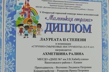 15 декабря 2019 года в ДШИ № 4 Советского района г.Казани состоялся V Открытый городской конкурс юных исполнителей «Маленькая страна», в котором приняли участие учащиеся и преподаватели нашей школы.По результатам конкурса:- в номинации «Струнно-смычковые инструменты. 6,5 – 8 лет», Ахметшина Ралина (преподаватель – Волченко Л.П., концертмейстер – Романова И.П.) – Лауреат II степени;- в номинации «Фортепиано. 9 – 10 лет», Павлова Антонина (преподаватель – Романова И.П.) – Дипломант III степени;- в номинации «Фортепиано. 9 – 10 лет», Насыбуллин Дамир (преподаватель – Романова И.П.) – Дипломант III степени.ПОЗДРАВЛЯЕМ НАШИХ ЛАУРЕАТОВ И ДИПЛОМАНТОВ!!! -