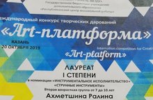 20 октября 2019 года в КДК им.Ленина Авиастроительного района г.Казани состоялся I Международный конкурс творческих дарований «ART-платформа».По результатам конкурса, учащаяся нашей школы Ахметшина Ралина (преподаватель – Волченко Л.П., концертмейстер – Романова И.П.), в номинации «Инструментальное исполнительство», «Струнные инструменты», вторая возрастная группа от 7 до 10 лет» – Лауреат I степени.ПОЗДРАВЛЯЕМ!!! -